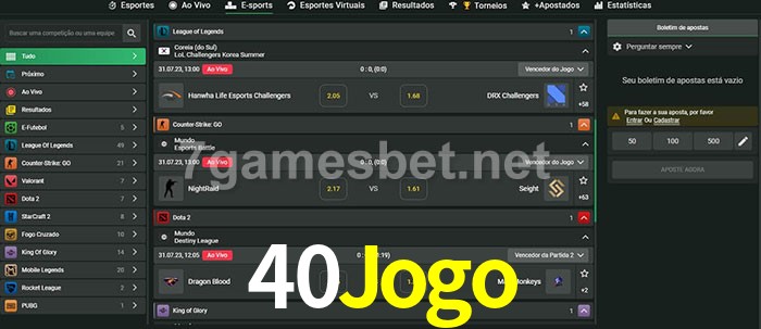 O 40Jogo oferece uma grande seleção de opções de apostas em e-sports com probabilidades competitivas